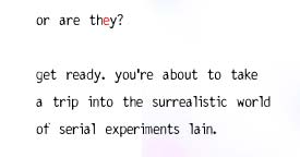The story itself begins with a young girl, Yomoda Chisa, at first seen doubled over in despair in a Tokyo alley and next seen standing precariously on the edge of a building's roof, grasping the handrail while trying to decide something. The depression of her existence seems suddenly to lift as her expression resolves into one of freedom, and indeed she looks much like a bird about to take flight as she comes to a decision and lets go of the railing -- only to fall a dozen stories to her death in what appears to be suicide. Things are not this final, however. At school the next day, one girl is driven to tears as she receives an e-mail from the dead girl. On closer observation, the classmates soon discover that everyone received the same e-mail. When asked if she received it too, Lain answers "I don't check my e-mail," whereupon her friend Alice says she should check her e-mail everyday. Later, Lain is sitting quietly in her room contemplating, and then asks her father for a new Navi, which surprises and amuses the man. "So you've finally caught the bug, eh?" he muses. Later, as Lain gets used to her new Navi, Chisa starts talking to her from out of the iridescent wash of data on the display screen. In response to Lain's question about the girl's death, Chisa replies, "If you can overcome the fear, you'll find that you don't need your body here." And when Lain asks why she would want to be there, Chisa says, "Because God exists here."