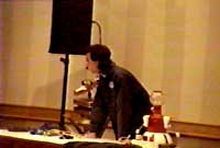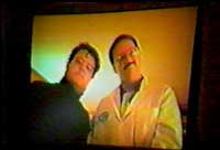 That was actually an experiment this year. The way we did it for 97 and 98, we just popped in the movie, hit play, and riffed it live. We had a script, I mean the script was like 60 pages long, and we practice over and over...basically what we do is sit down, and have about a dozen writing sessions, with whatever writers I can get together. I'm normally present for those, which is why I've seen the movie the most of everyone. We riff the heck out of it, get all the lines down, try to write cues and then I take this wad of paper about two inches thick of everyone's gags, and I sit down with a laptop and watch the movie over and over and over again getting things timed out; making sure that our riffs aren't on top of anyone's line on screen, making sure there isn't an explosion going on while we're trying to talk so you can't hear us, making sure the gags are in the right place because occasionally, we're riffing so fast, (the writers) forget to write down cues. So I'm going "this is a great line! Where does it go? I have no clue!". So we come in with a script, as I un-digress, having rehearsed the living hell out of it, and we riff it live, that was 97 and 98, for (M.D.) Geist and (Battle Arena) Toshinden. This year, because the sound on Geist was really bad, (we got it a little better on Toshinden but it was still kind of bad) so I decided to try an experiment this year, and what I did was I went out and bought a mixing board that was about as expensive as a car payment on my Jeep, and we mixed it, played the tape, and riffed it in-studio, and it worked a little better. We're going to have to do a post-mortem on it and see if we want to do it again next year, cause it's a question of, you've got the script memorized so you could have done it live and realize 'Oh, I just came up with an ad-lib.' I'd really want to do it but I have my microphone turned off.