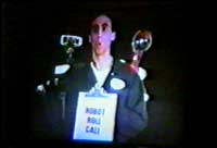Well the original crew...Well I started out with the idea and with getting Bernhard and all that. Bernhard is our prop wrangler and he's also plays Anime's Frank. I'm the producer, director, head writer, and the general guy who has to watch the movie the most times, (shudder) and I do Tom Servo. Mark Sacks(sp) is Joel (Joel Saotome), and one of the writers. Joe F?(sp), another one of the chief writers, does Crow. Matt Pyson does Dr. Forrest Clay, and he has a wonderful evil laugh , and looks good in a grease paint mustache. Well it was sort of just that, the five of us, and anyone else we could drag in. At this point, I've managed to pull in probably around fifteen writers. We've got Sue and Carl Monroe, my fiancee Ivy Martin, Donna Eulen, geez lots of people. I have the entire list at home. Anyone we could drag in basically, um, Chris Ochs, Mike Ryan, John Atchison. Basically, something on the order of probably around 15% of the convention committee has written for me at some point (laugh).