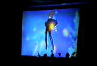 In 1997, we had a video theater, and I think that was the year that we seated around 800, and it was standing room only. I was running live programming at that time, basically in charge of any programming that wasn't video. Something that you didn't just sit on your ass and watch. We said, "we'll try MAT as an experiment. We'll take the time slot nobody wants, Friday at midnight:" No one wants Friday at midnight, we'll try it. and it was standing room only Friday at midnight. It looked pretty good, the bots looked really good, the anime was atrocious, M.D. Geist (shudder). One of our writers still if you go up and say 'Geist!', he goes "AH!" The costumes looked really good. Bernhard does a really good job on the costumes and, you know, props. We had the problem that getting the mix between the movie and the speech, the riffing, is really hard. Especially the bad movies, because they are really really really really badly done (really?). The volume just wanders up and down, the FX and the voice of the actors are at the wrong levels. Lensman, we were sitting there watching the levels on Lensman while doing it, and like Buskirk, who's the big bison guy, his levels are about 10% above normal, and Kim, the whiny 'hero', is about 20% below normal, so we're saying how are you going to raise up Kim's voice so you can hear it and not have Buskirk's voice blowing out the ears of everyone in the front row? Um, you don't. It's a very bad movie and there's nothing you can do about it, so it sounded kind of crappy. Looked great, though.